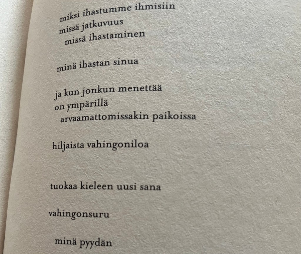 Arno Kotron Sanovat sitä rakkaudeksi -kirjan sain ystävältäni Nooralta, koska olin maininnut lukeneeni viime aikoina myös runoja. Ilmeisesti on käyty debattia siitä, onko Sanovat sitä rakkaudeksi edes ”oikea” runokirja, koska ilmaisu on niin lähellä proosaa. Oli miten oli, minä ihastelin kirjassa yhdistyvää proosan helppolukuisuutta ja toisaalta runouden ja aforismien kykyä kiteyttää sanoma. Onhan esimerkiksi tämä niin mainio tapa ilmaista parisuhteeseen ja sen menettämiseen liittyviä tuntoja: