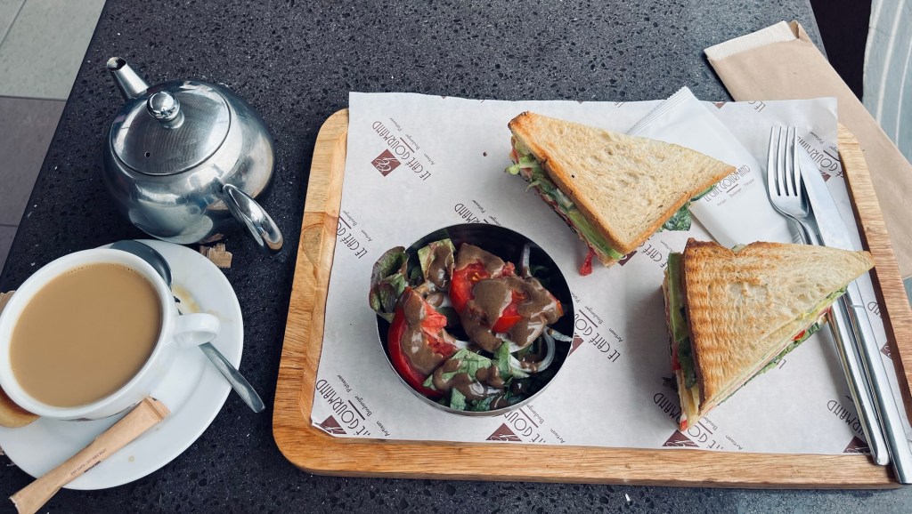 Café Gourmandissa ehdin nauttia lähes eurooppalaisissa hinnoissa pyörivän, mutta herkullisen kasvisversion club sandwich -ateriasta. Elina tuli hakemaan minut kahvilasta ja ajelimme reilun parin tunnin matkan, Bujumburasta järven rannalta Rumongeen saman järven rannalle.