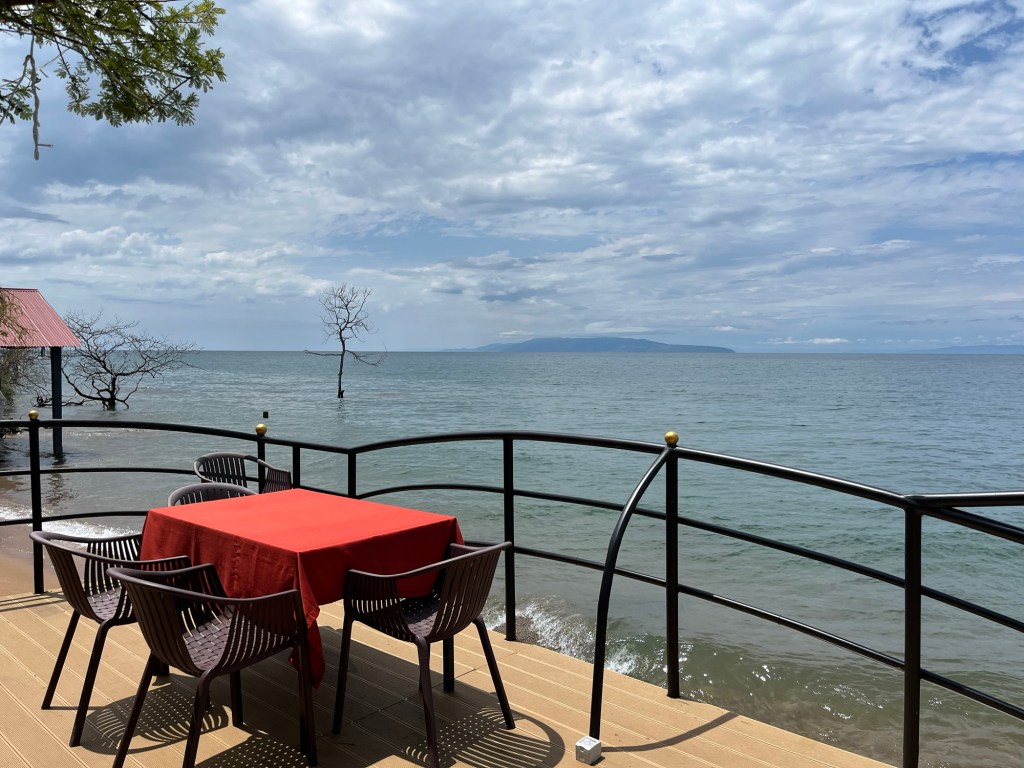Jo saapuessamme Bluebayhin huomiomme kiinnitti rantavedessä lähes puolirunkoon seisovat puut. Elina oli omistajien kanssa jutellessaan saanut selville, että vielä viime vuonna puiden välissä oli pelattu jalkapalloa. Ilmastonmuutos etenee Burundissakin: ilmeisesti vastarannalla Kongossa sijaitseviin sademetsiin liittyvät sateet ovat viime vuosina yltyneet aiheuttaen pahoja tulvia. Onneksi Bluebayssä rakennukset sijaitsevat toistaiseksi tarpeeksi kaukana rantaviivasta. Elina kertoi, että Bujumburassa useita rantaravintoloita on suljettu tulvien johdosta. Malawi-järven majoituksessamme Butterfly Spacessa oli iso laiturialue tuhoutunut tulvan seurauksena.