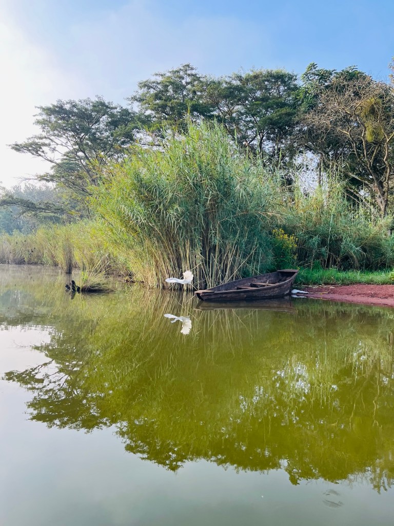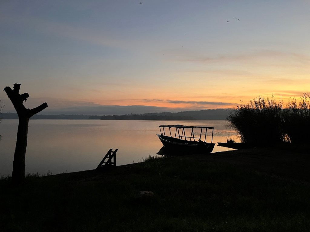 Herääminen ajoissa kannatti, sillä pääsimme kokemaan auringonnousun rikkumattoman hiljaisella ja tyynellä Rwihinda-järvellä, seuranamme vain linnut ja muutama aamuvirkku kalastaja. Paikalliset oppaamme soutivat meidät saareen, jossa heidän kertomansa mukaan elää yhteensä 96 lintulajia, muun muassa kuningaskalastajia ja ibiksiä. Haukkakin nähtiin, sitä ei tosin kalalla houkuteltu lähelle venettä kuten Malawi-järven veneajelulla.